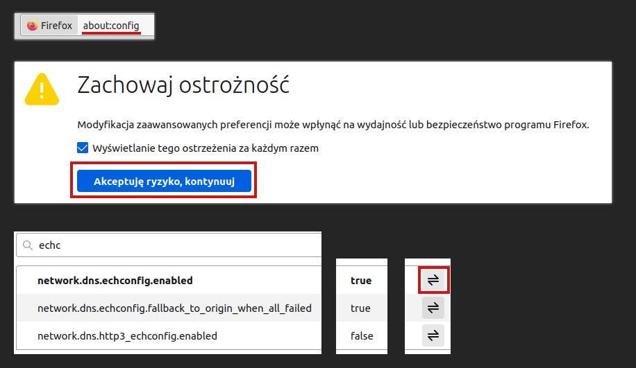Wpisujemy w pasku górnym about:config, potwierdzamy że akceptujemy ryzyko. W pasku wyszukiwania zaczynamy wpisywać echc, a powinna wyskoczyć nam opcja network.dns.echconfig.enabled. Klikamy po prawej stronie, żeby zmieniła wartość na true.